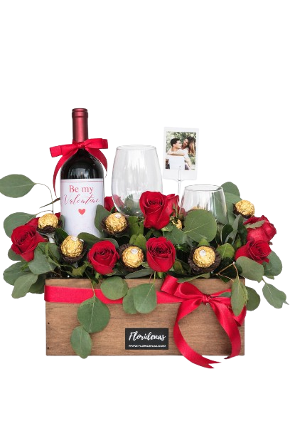 Romantico arreglo de 12 rosas y chocolates con finos follajes, acompañado de vino tinto con etiqueta personalizada, 2 copas de vino y foto polaroid.
