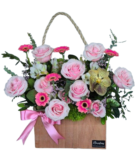 Tierna canasta de rosas, orquídea vanda, gerberas y finos follajes.