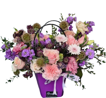 Tierna bolsa de rosas, margarita, claveles y finos follajes