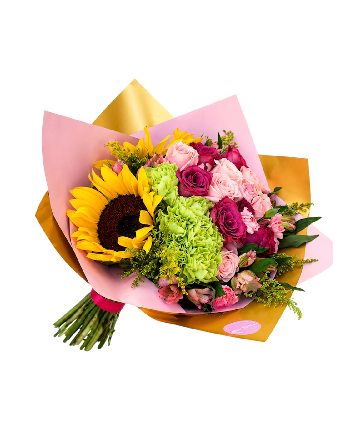 Bouquet con rosas, girasoles, mini rosas, claveles y finos follajes, envuelto en wrapping paper.