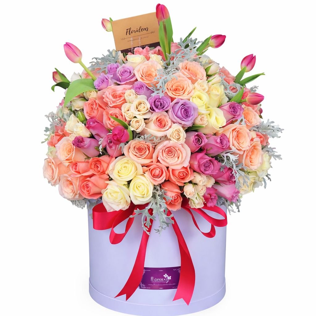 Bombonera con rosas, mix de flores, tulipanes y finos follajes. La combinación de color puede ser de su preferencia.