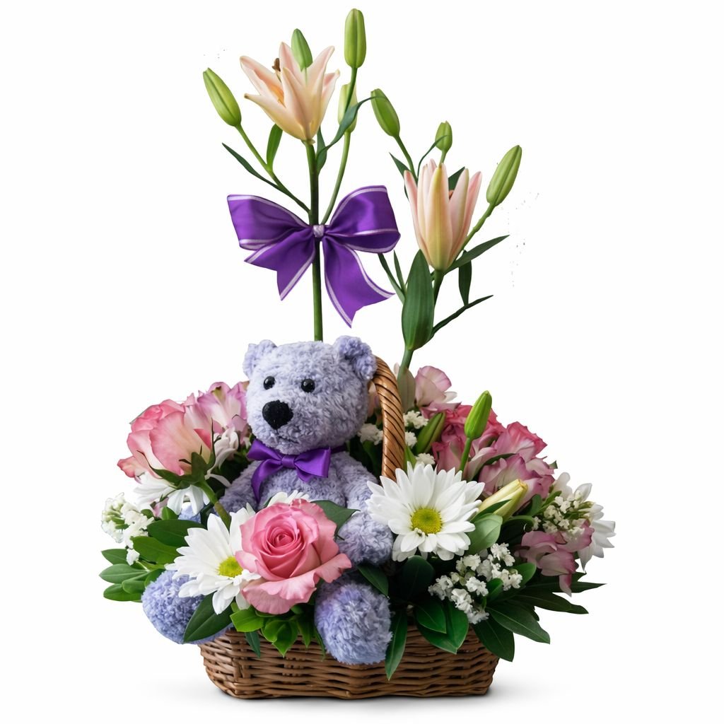 Canasta con rosas, lilis, alstromelias, margaritas y finos follajes.