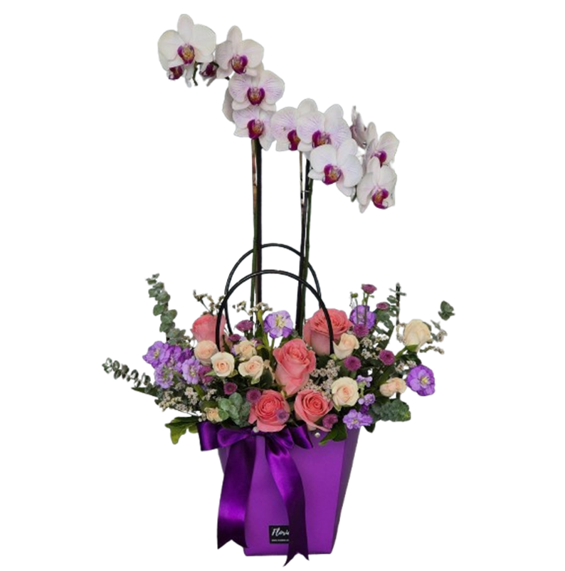 Elegante diseño con planta Orquídea Phalaenopsis y decoración con mariposas.