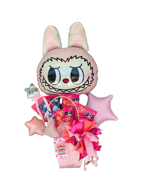 Encantadora bolsa con globo de Labubu, cacahuates y frituras acompañada de globos y dedicatoria de feliz cumpleaños.