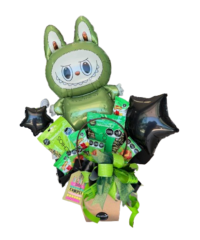 Hermoso arreglo de globos acompañado de pistaches, gomitas y paletas. Con tarjeta de cumpleaños