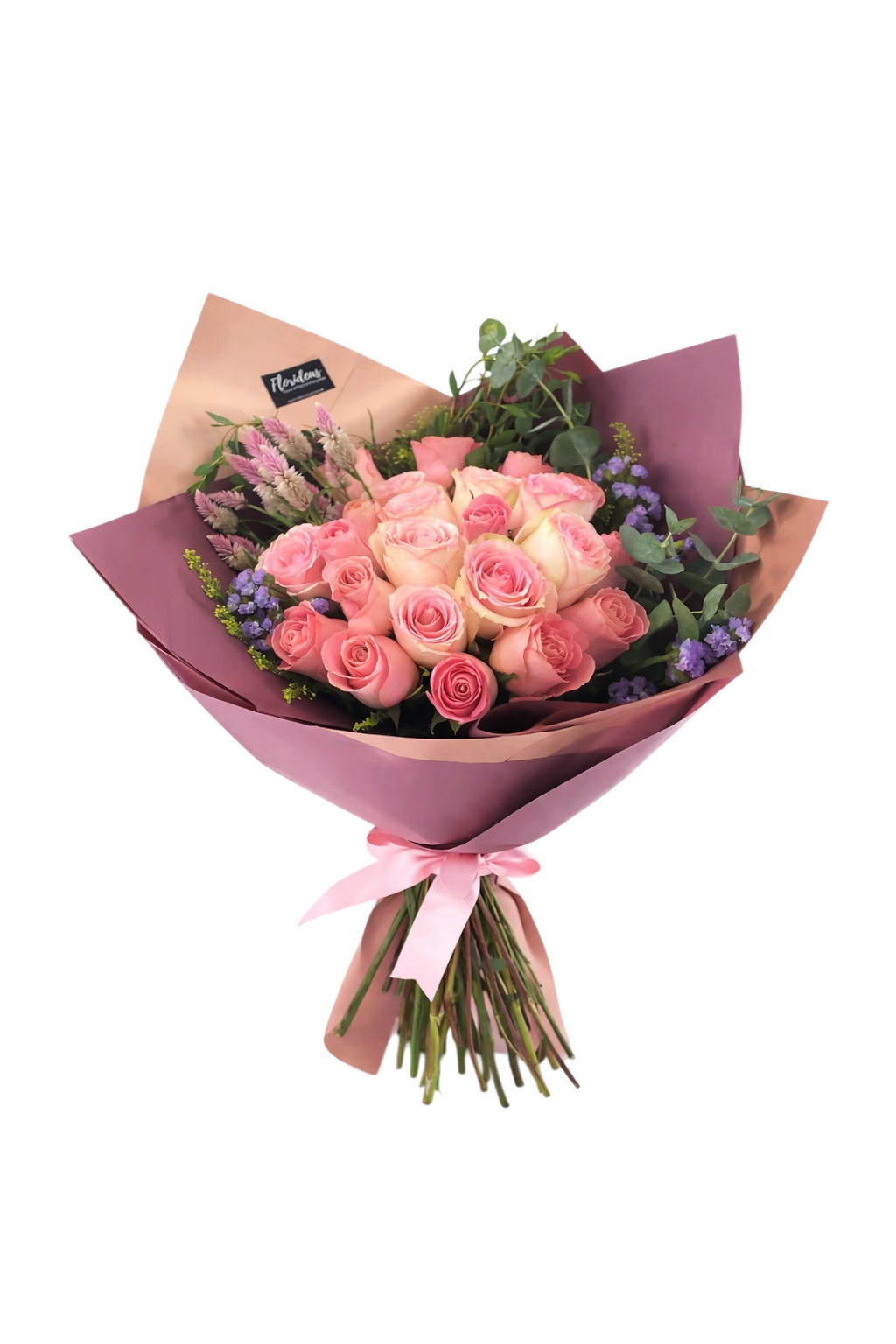 Bouquet con 20 rosas y finos follajes. Decorado con wrapping paper.