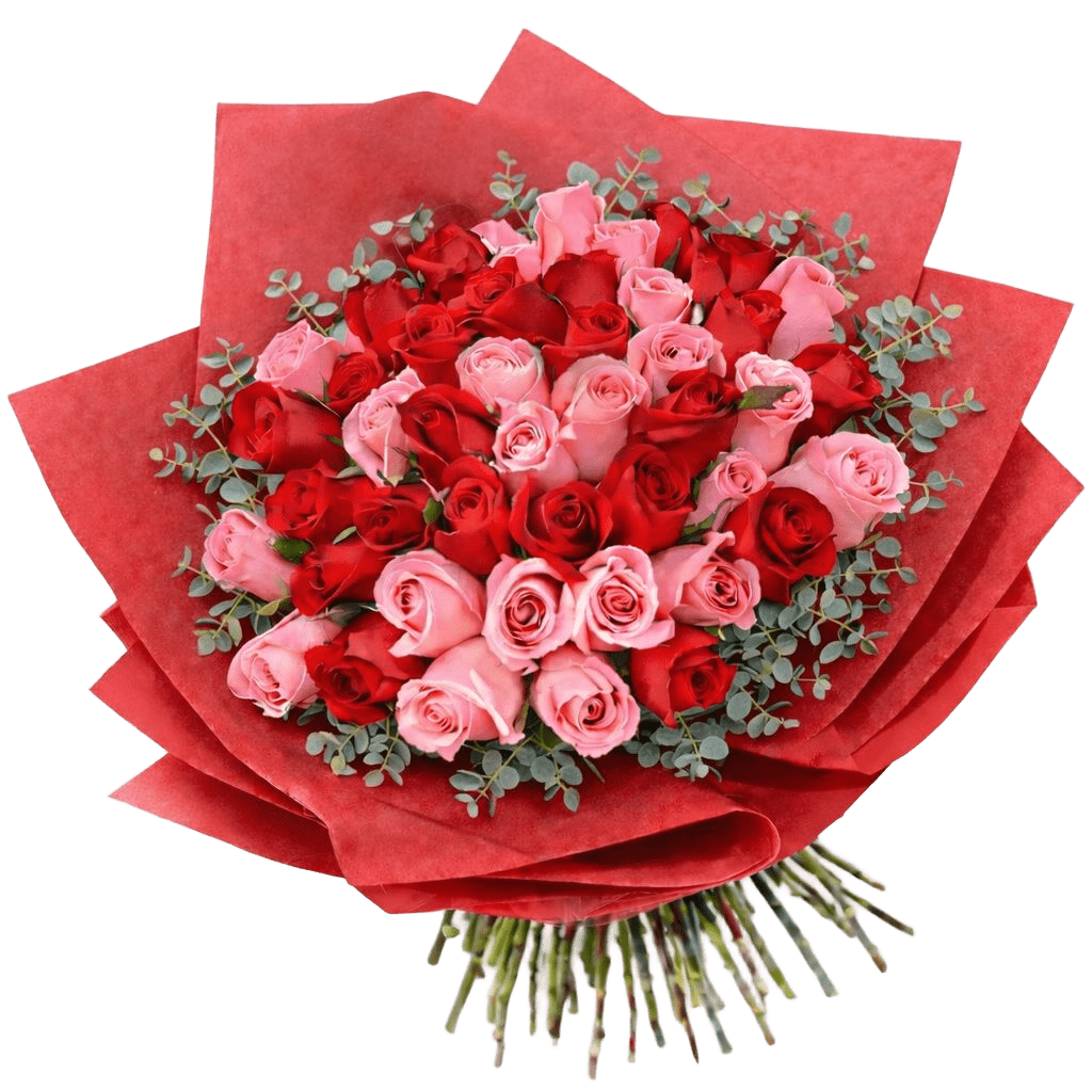 Bouquet con 50 Rosas y finos follajes, envuelto en wrapping paper. Puede elegir la combinación de color de su elección.
