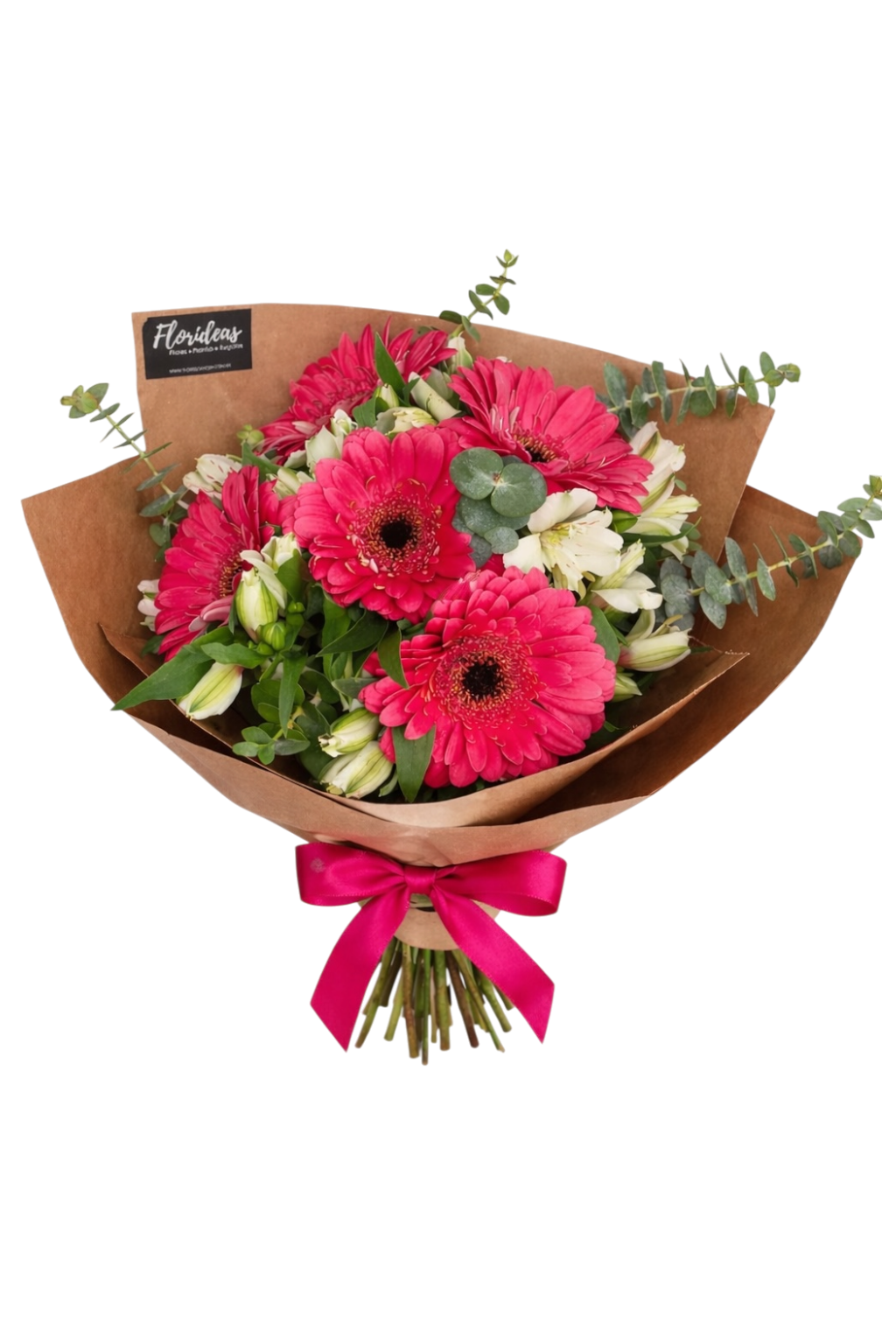 Bouquet de gerberas y mix de follajes. Decorado con papel Kraft. El color de las flores puede cambiar según disponibilidad.