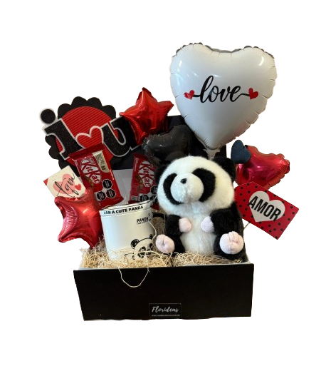 Romantico arreglo de peluche y taza de panda con cuchara azucarera, chocolates y carteles de amor.