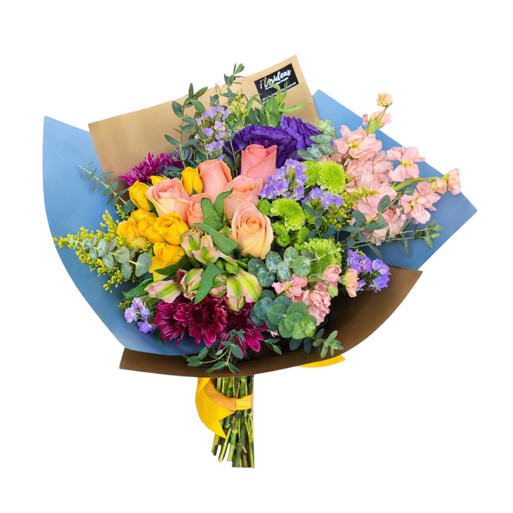 Bouquet con rosas, astromelias, matiolas, mix de flores y finos follajes. Decorado con wrapping paper.