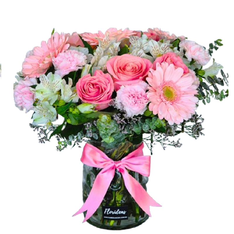 Jarrón de gerberas, rosas, claveles y finos follajes