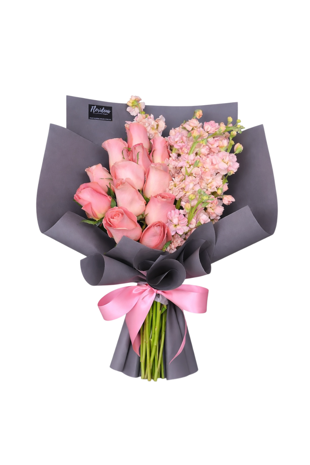 Bouquet con rosas y matiolas. Decorado con wrapping paper.