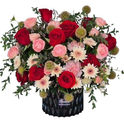 Arreglo de rosas, mini rosas, claveles, margarita y finos follajes.