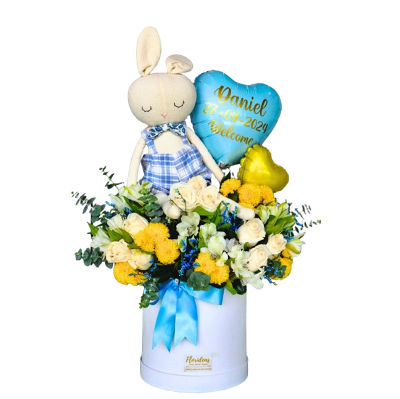 Tierna bombonera de conejo con rosas, margarita y astromelias, decorado con globos y vinil personalizado de bienvenido Bebé.